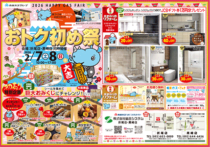 イベント案内 EVENT GUIDE 2026年 2月 2025年 12月 11月 10月 8月 6月 4月 2月 2024年 12月 10月 6月 2月 2023年 12月 10月 8月 2月 2022年 12月 10月 6月 2月 2021年 11月 10月 6月 4月 1月 2020年 10月 6月 1月 2019年 12月 11月 10月 9月 8月 7月 6月 5月 4月 2月 2018年 12月 11月 10月 9月 8月 6月 5月 4月 2月 2017年 12月 11月 10月 9月 7月 5月 2月 2016年 12月 11月 10月 8月 7月 5月 2月 2015年 11月 8月 7月 2026年2月 おトク初め祭 開催場所:折尾店・黒崎店同時開催日時:2026年2月7日(土)~2月8日(日)10:00~17:00 チラシはこちらをクリックして下さい。